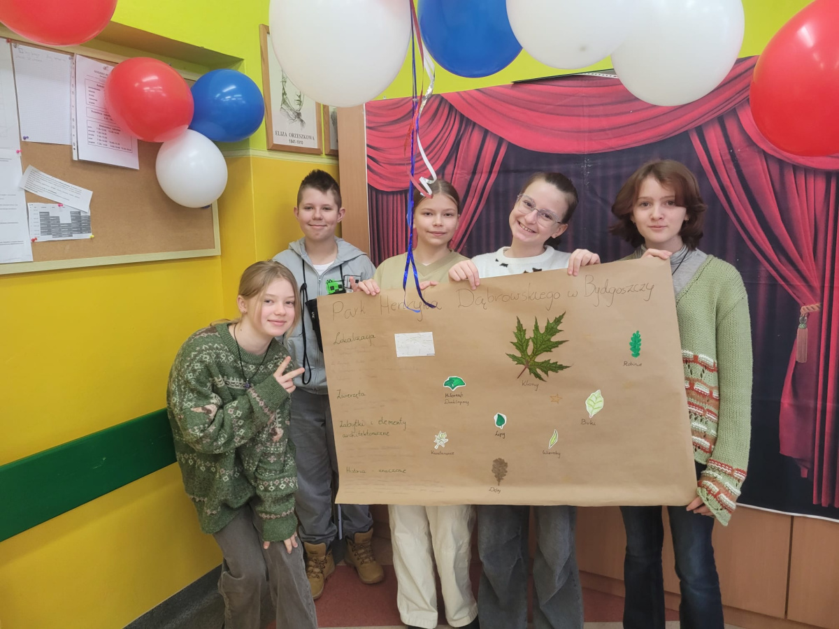 Na biologii zapoznaliśmy się z fauną, florą oraz zabytkami wybranych parków miejskich. Wykorzystaliśmy liście znalezione w czasie spaceru po Bydgoszczy.  Z zebranych wiadomość powstały  ciekawe plakaty.