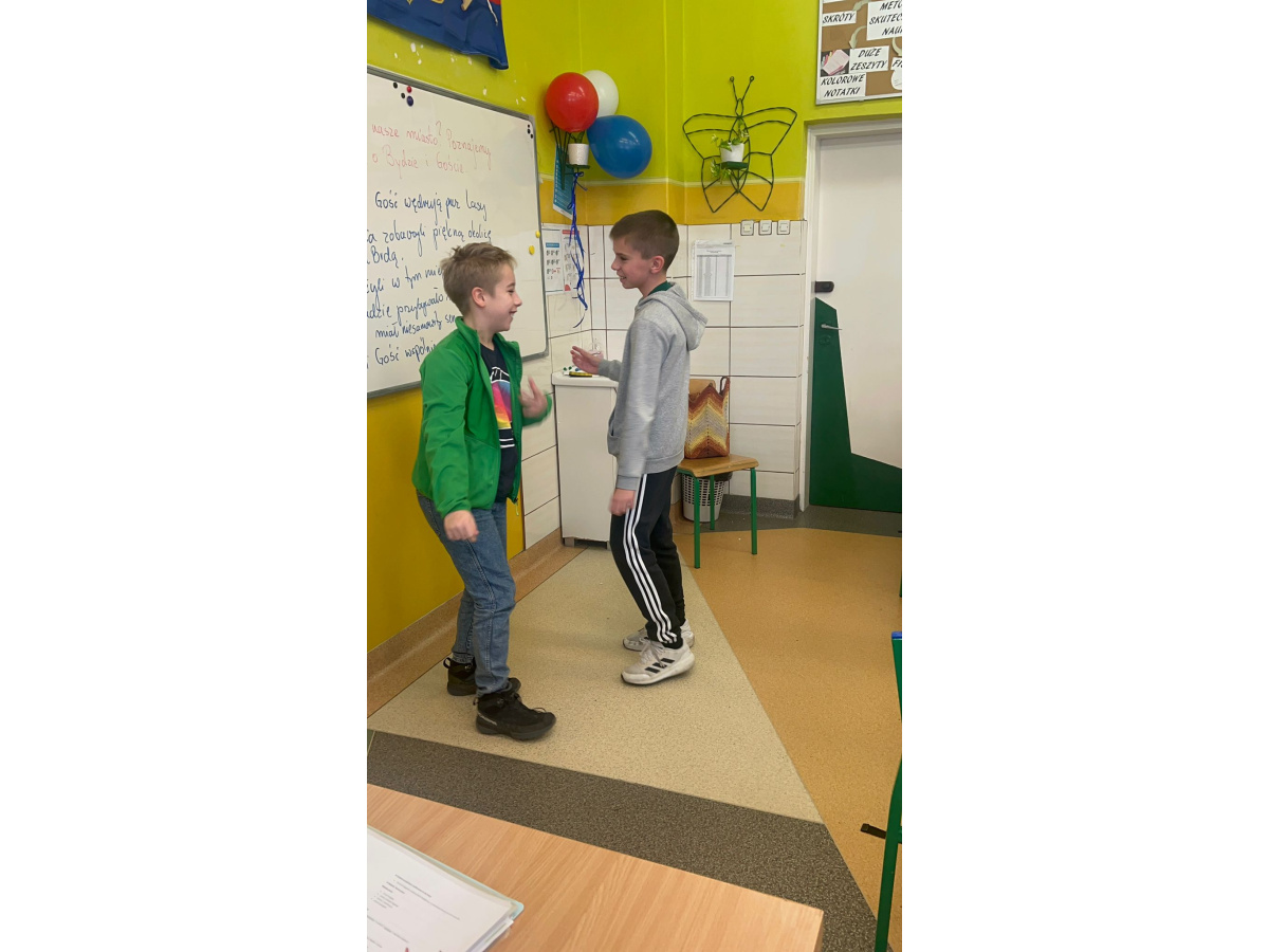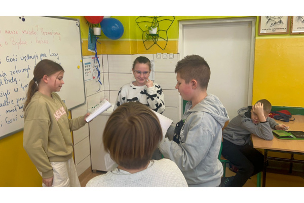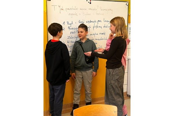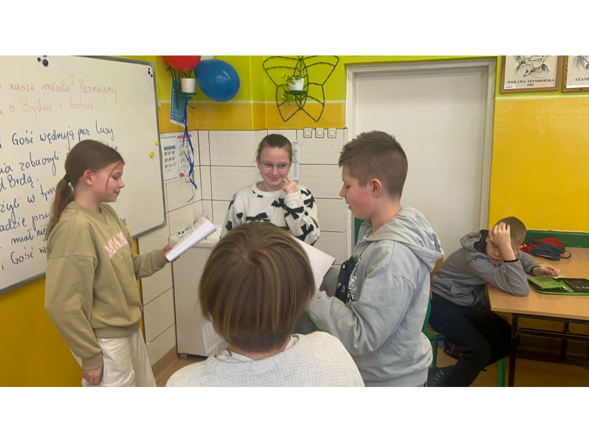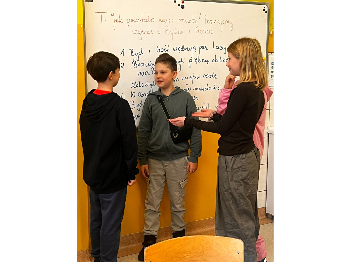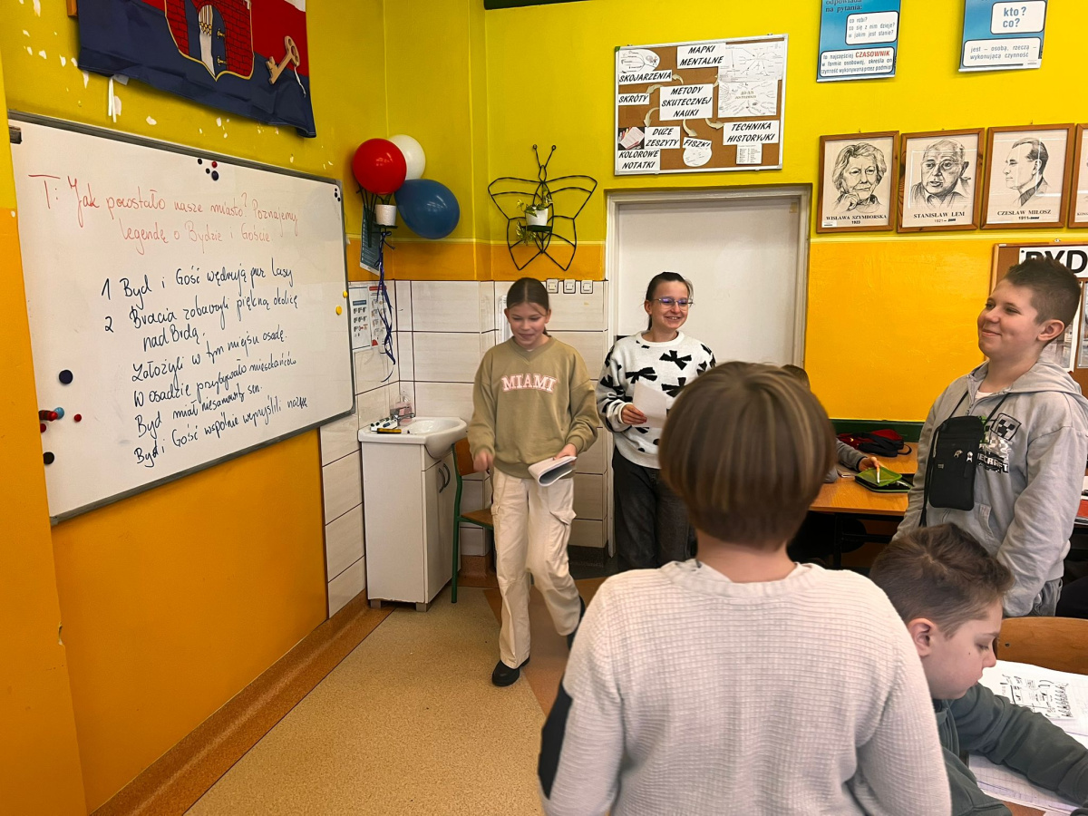 Na języku polskim poznaliśmy legendę o Bydzie i Goście – założycielach naszego miasta. Po przeczytaniu i omówieniu tekstu przedstawiliśmy własną adaptację legendy. Wybrane zespoły odgrywały krótkie przedstawienie. Pozostałe grupy tworzyły tzw. żywe obrazy, czyli „zastygały” w miejscu tworząc „obraz” wybranej przez siebie sceny z legendy. Okazało się, że niektórzy z nas mają ogromny talent aktorki!