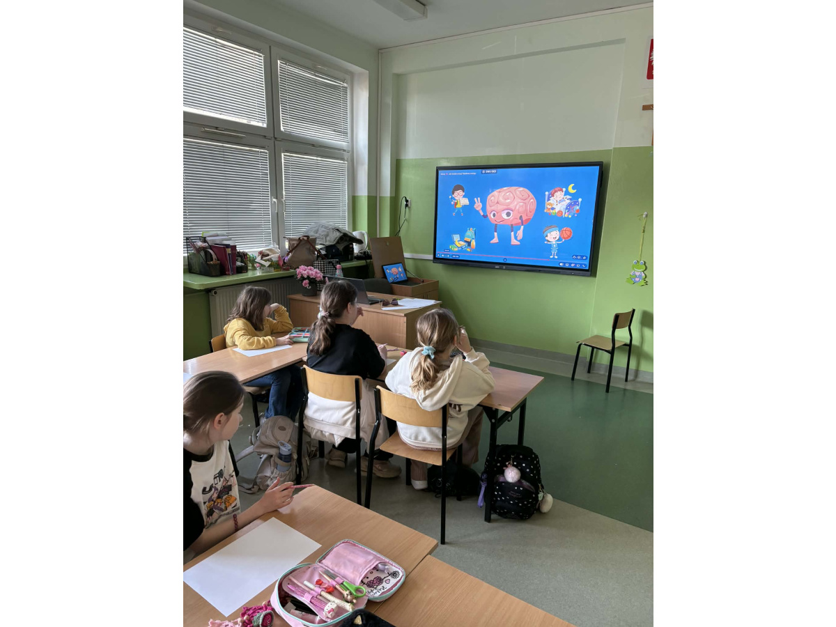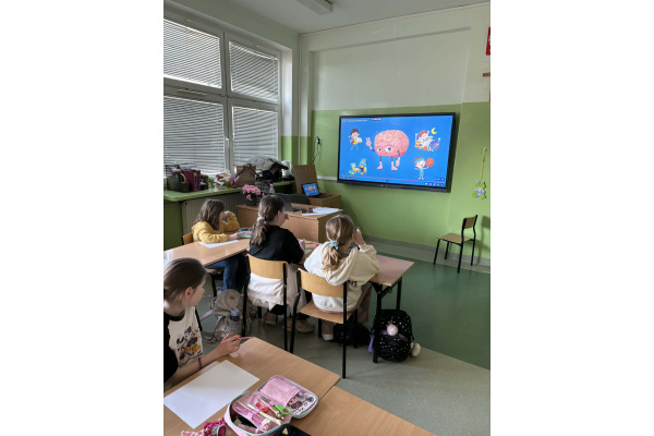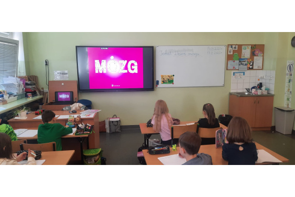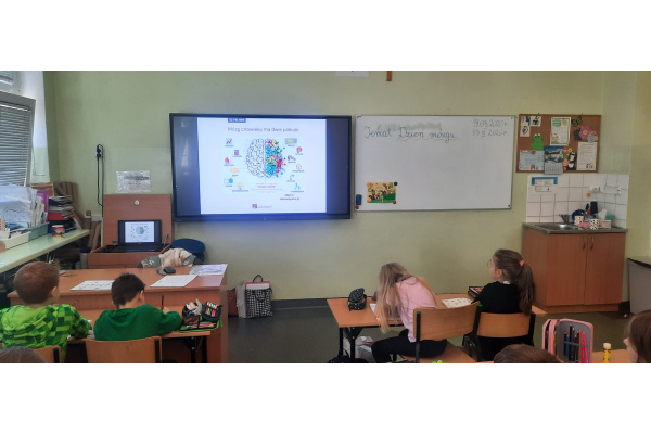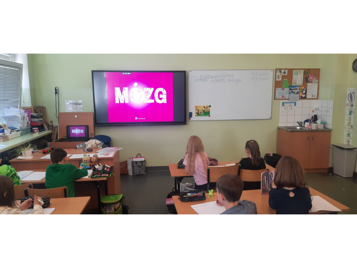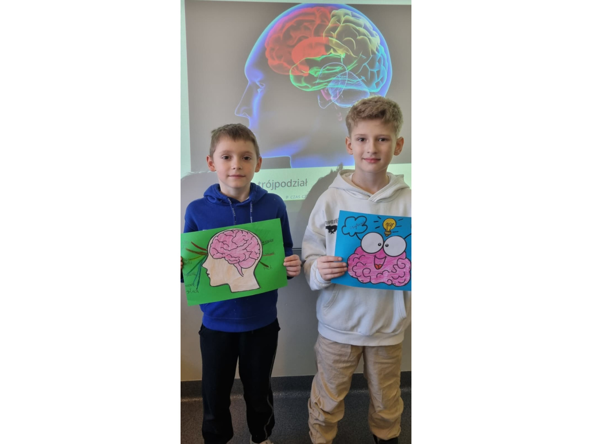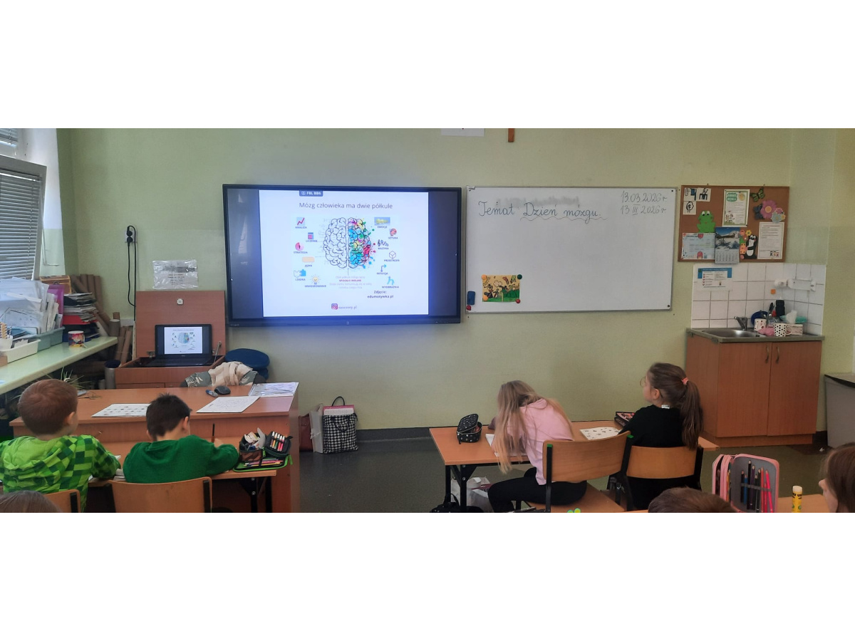 b) w klasach 1-3 działania rozpoczęły się od wprowadzenia w temat – prezentacja multimedialna oraz film, który przybliżył uczniom budowę i funkcjonowanie mózgu. Następnie mieli oni okazję sprawdzić swoją wiedzę, rozwiązując quizy tematyczne. Kolejnym etapem była praktyczna gimnastyka dla mózgu – zestaw ćwiczeń ruchowych połączonych z technikami oddechowymi, które wspierają koncentrację, koordynację oraz współpracę obu półkul mózgowych. Podczas części warsztatowej uczniowie wykonywali różnorodne zadania rozwijające pamięć i spostrzegawczość, m.in.: wyszukiwanie określonych liczb wśród wielu znaków, odnajdywanie ukrytych w wyrazach nazw zwierząt, rysowanie jednocześnie obiema rękami, zadania językowe polegające na tworzeniu jak największej liczby słów spełniających. Na zakończenie uczestnicy wykonywali kolorowanki edukacyjne;