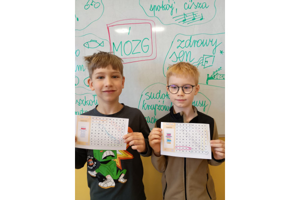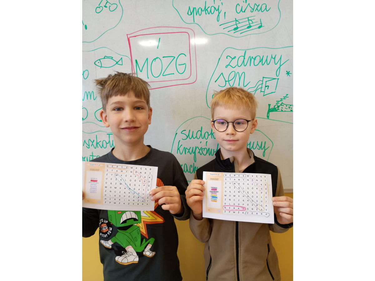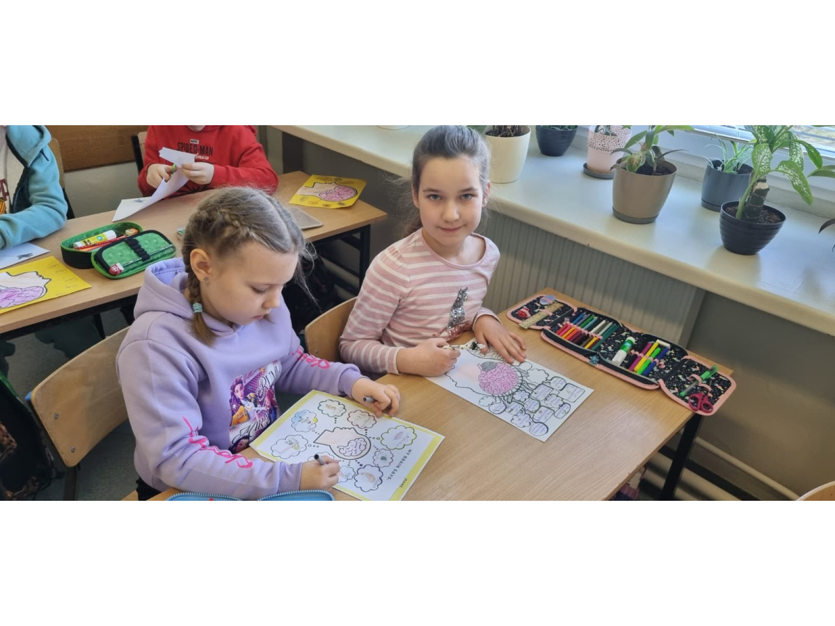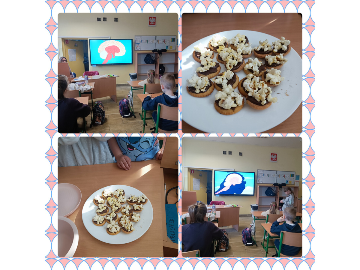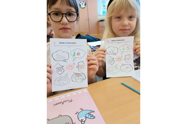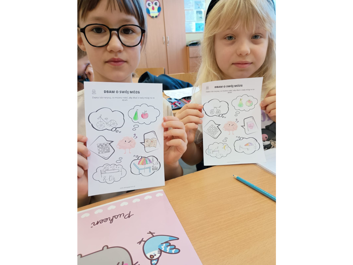 b) w klasach 1-3 działania rozpoczęły się od wprowadzenia w temat – prezentacja multimedialna oraz film, który przybliżył uczniom budowę i funkcjonowanie mózgu. Następnie mieli oni okazję sprawdzić swoją wiedzę, rozwiązując quizy tematyczne. Kolejnym etapem była praktyczna gimnastyka dla mózgu – zestaw ćwiczeń ruchowych połączonych z technikami oddechowymi, które wspierają koncentrację, koordynację oraz współpracę obu półkul mózgowych. Podczas części warsztatowej uczniowie wykonywali różnorodne zadania rozwijające pamięć i spostrzegawczość, m.in.: wyszukiwanie określonych liczb wśród wielu znaków, odnajdywanie ukrytych w wyrazach nazw zwierząt, rysowanie jednocześnie obiema rękami, zadania językowe polegające na tworzeniu jak największej liczby słów spełniających. Na zakończenie uczestnicy wykonywali kolorowanki edukacyjne;