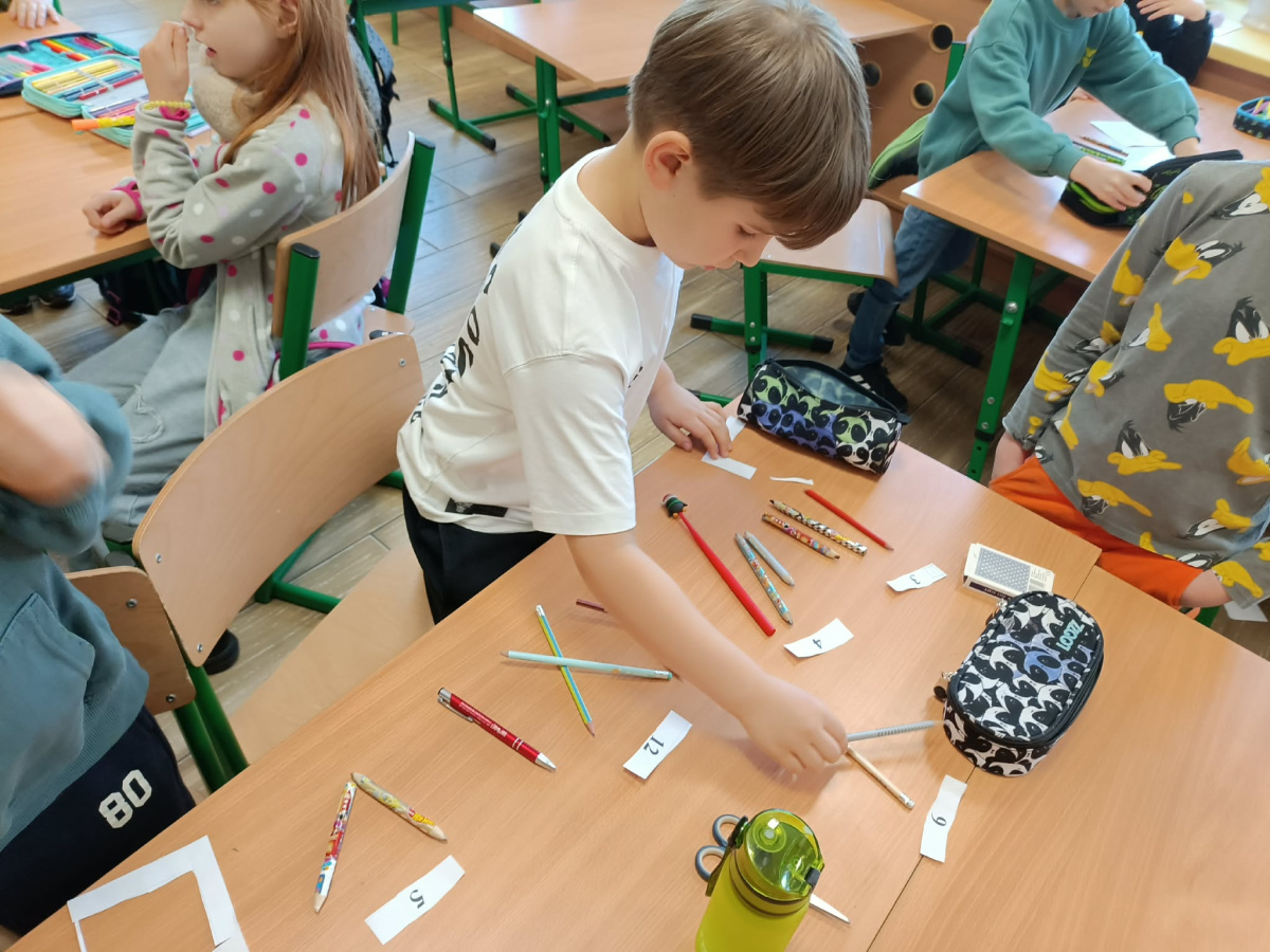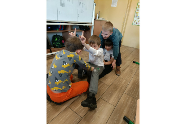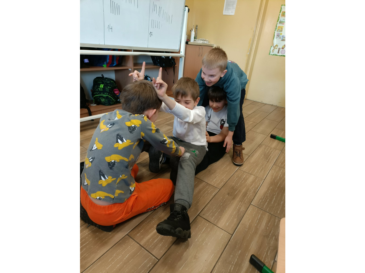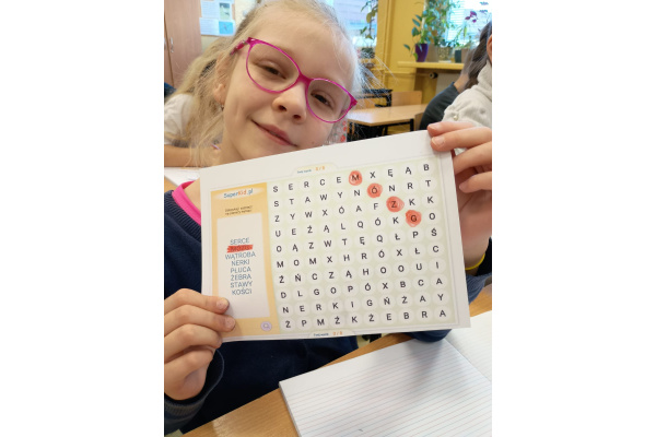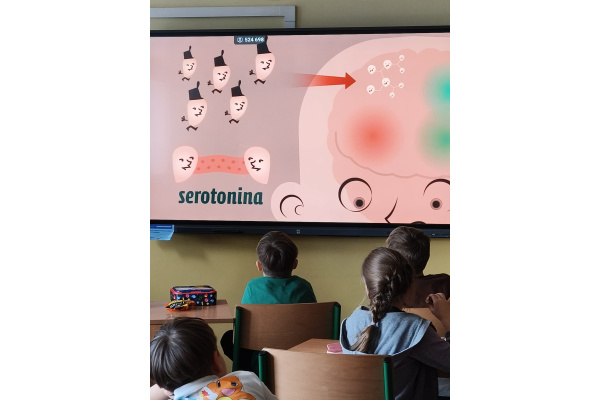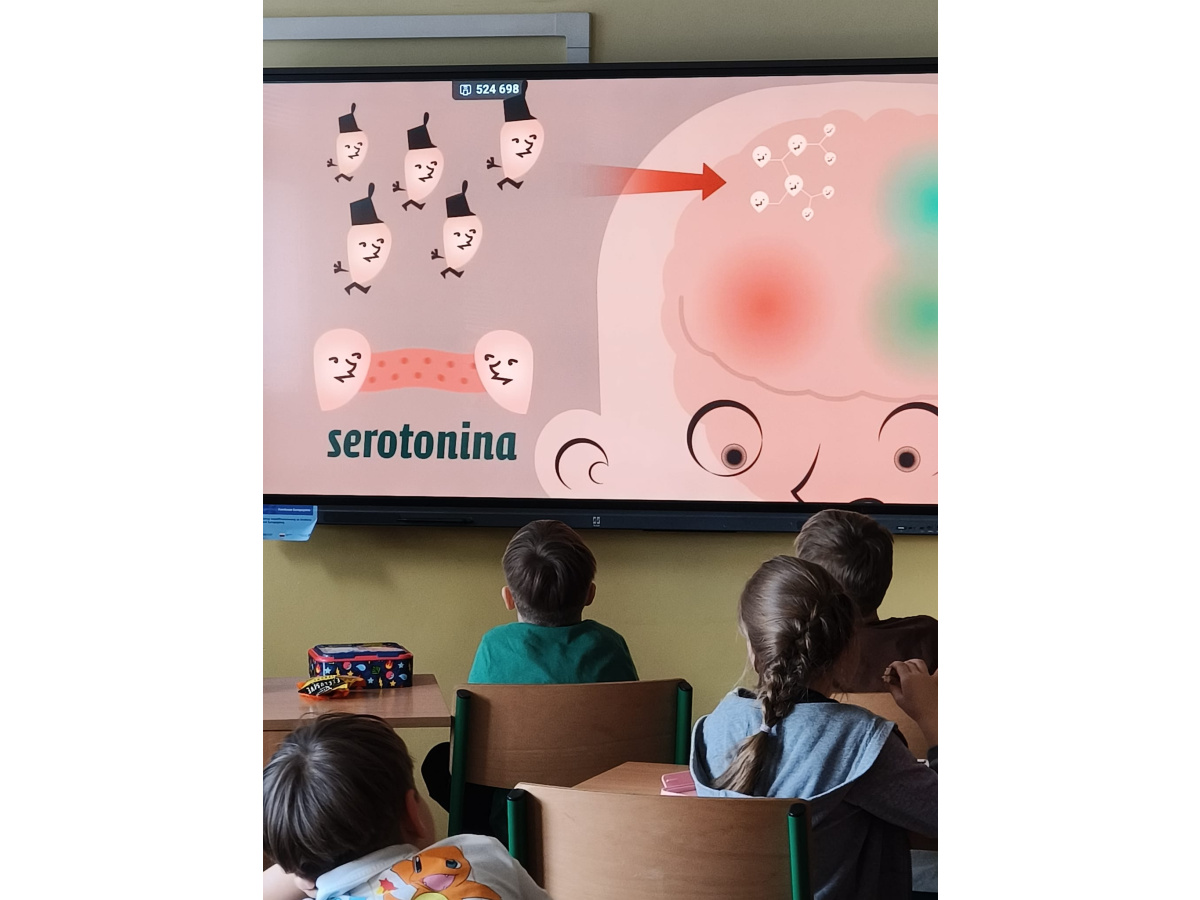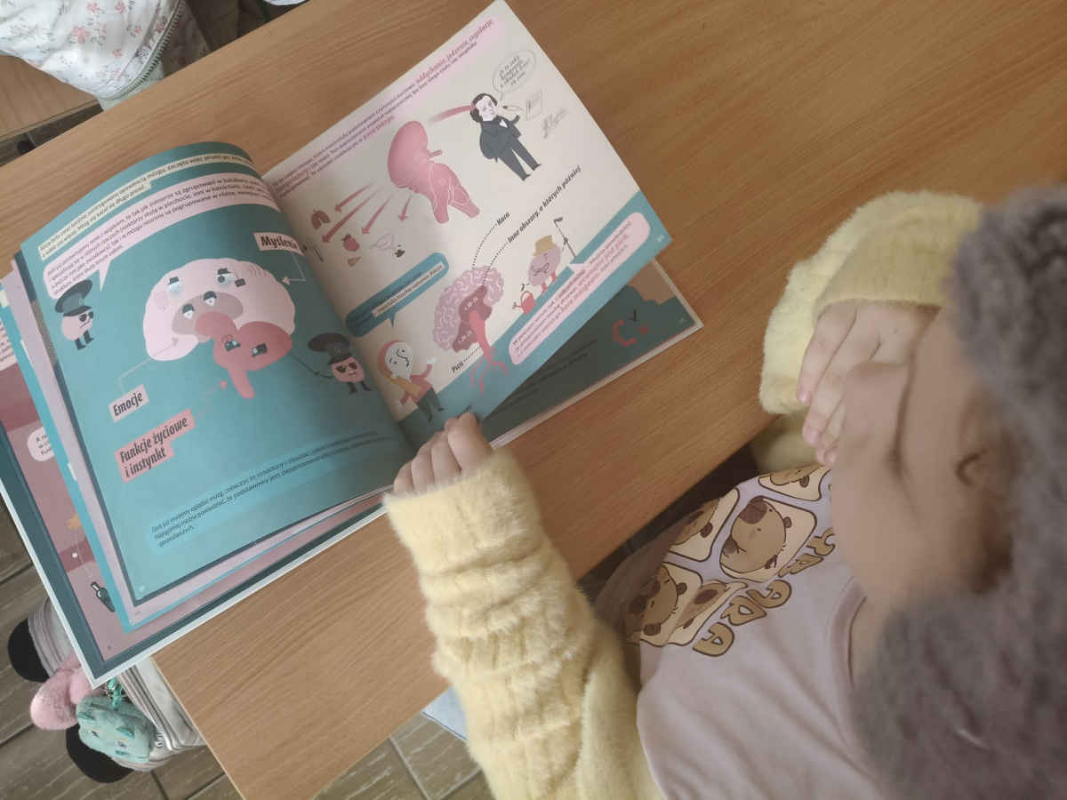 b) w klasach 1-3 działania rozpoczęły się od wprowadzenia w temat – prezentacja multimedialna oraz film, który przybliżył uczniom budowę i funkcjonowanie mózgu. Następnie mieli oni okazję sprawdzić swoją wiedzę, rozwiązując quizy tematyczne. Kolejnym etapem była praktyczna gimnastyka dla mózgu – zestaw ćwiczeń ruchowych połączonych z technikami oddechowymi, które wspierają koncentrację, koordynację oraz współpracę obu półkul mózgowych. Podczas części warsztatowej uczniowie wykonywali różnorodne zadania rozwijające pamięć i spostrzegawczość, m.in.: wyszukiwanie określonych liczb wśród wielu znaków, odnajdywanie ukrytych w wyrazach nazw zwierząt, rysowanie jednocześnie obiema rękami, zadania językowe polegające na tworzeniu jak największej liczby słów spełniających. Na zakończenie uczestnicy wykonywali kolorowanki edukacyjne;