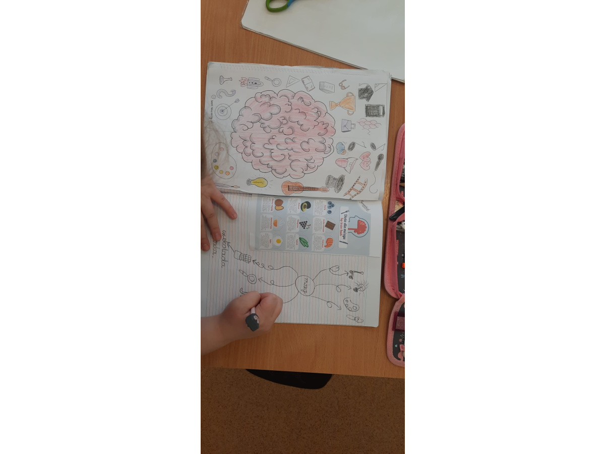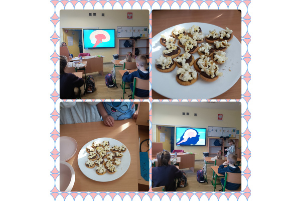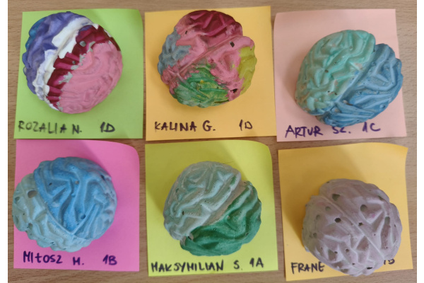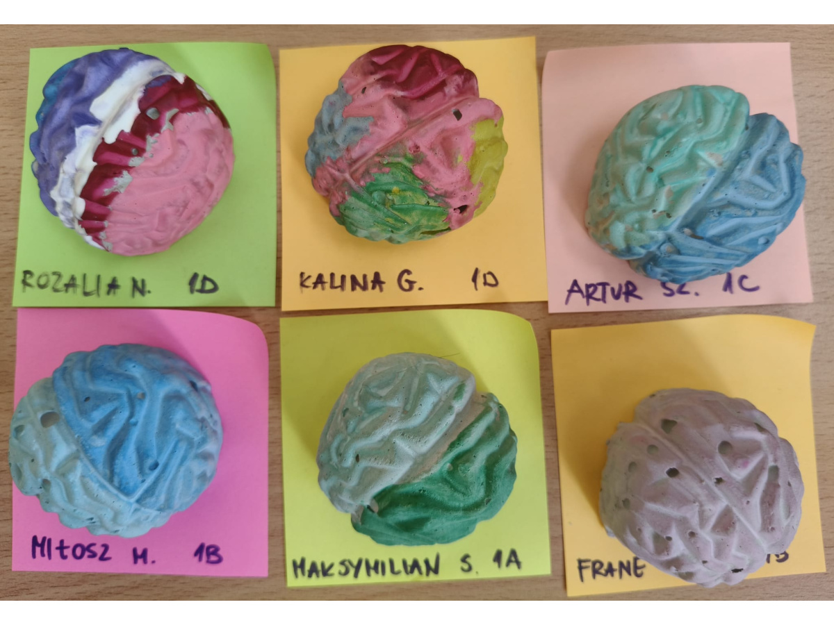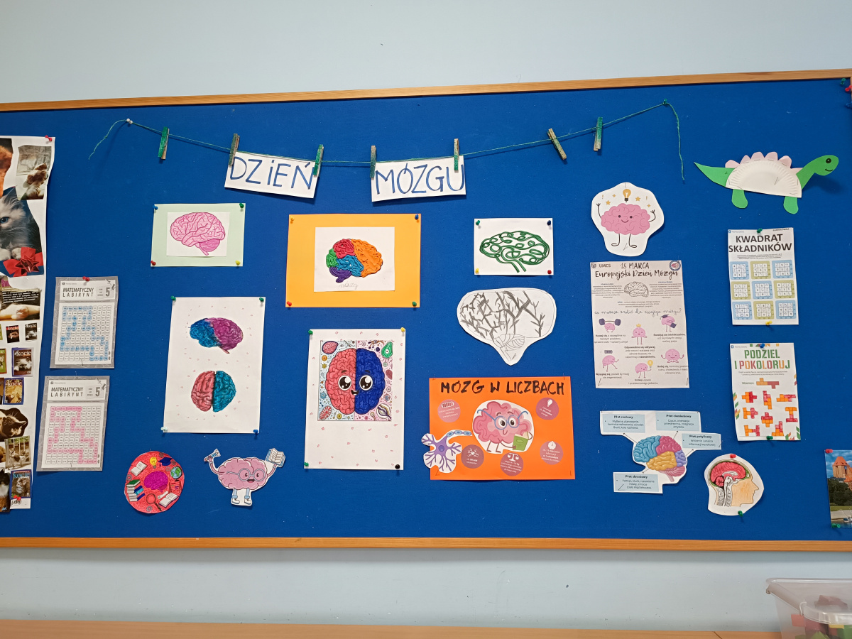 c) w świetlicy szkolnej - dzieci obejrzały i wysłuchały słuchowiska na podstawie książki prof. Vetulaniego pt. "Sen Alicji ", malowały gipsowe mózgi oraz przedstawiały jego budowę przy pomocy kolorowej włóczki, plasteliny oraz plakatów. Nie zabrakło również ćwiczeń dla mózgu - były zarówno łamigłówki i zadania logiczne;