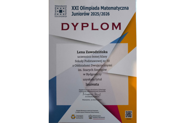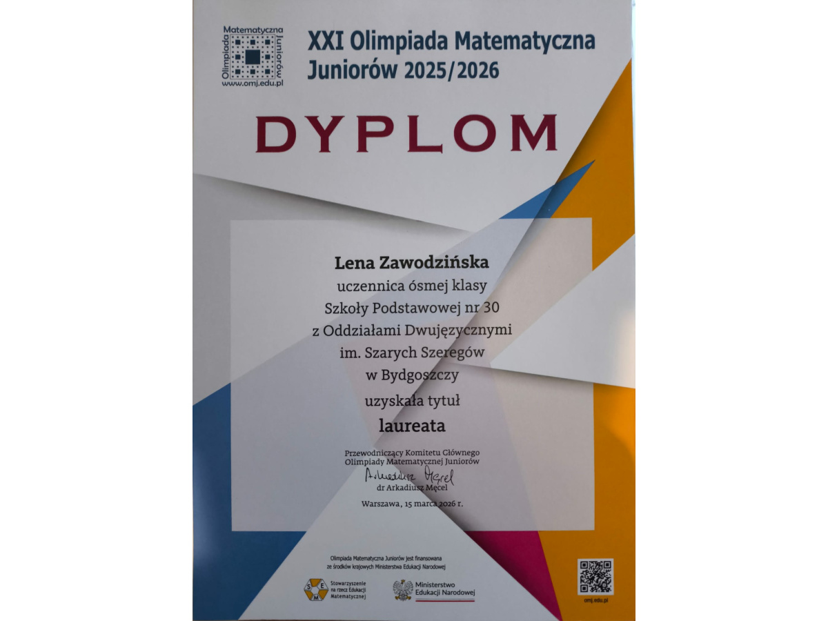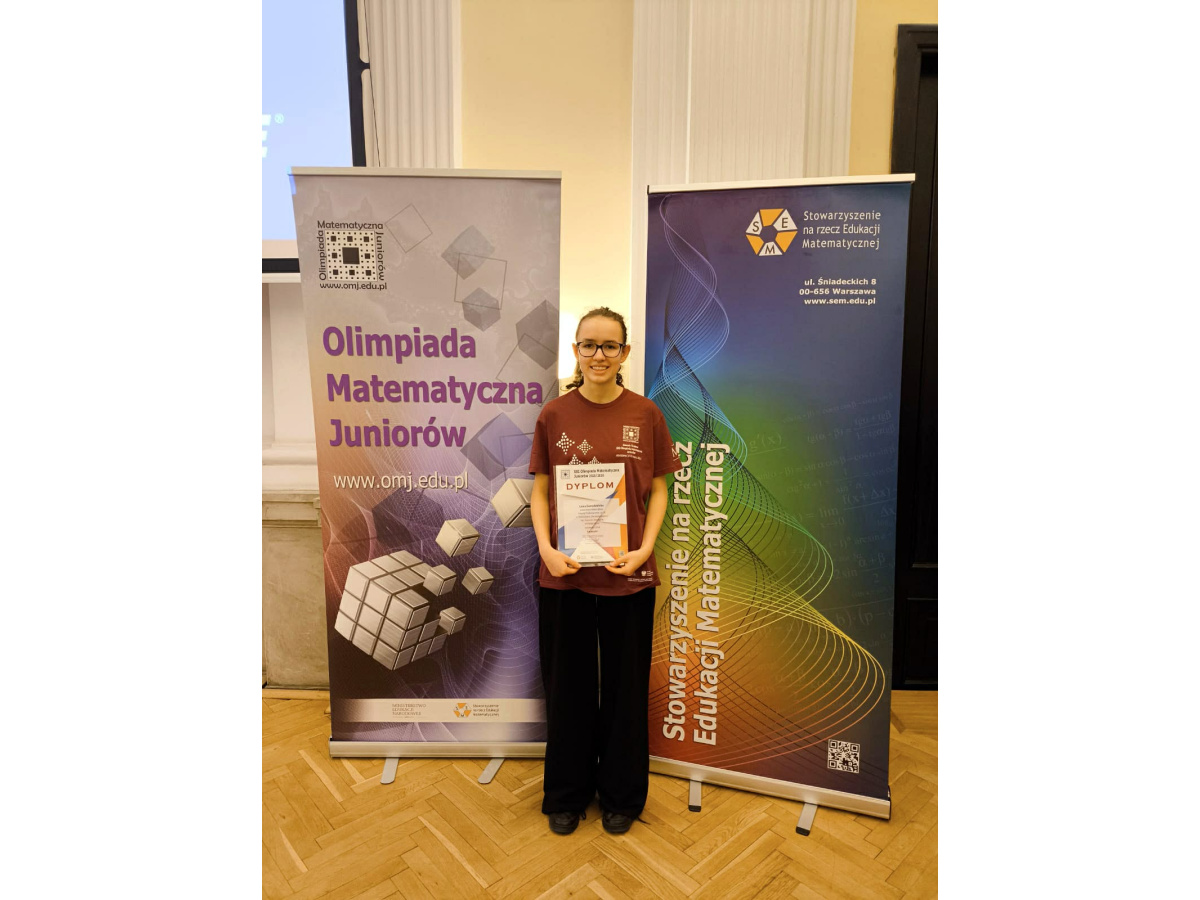Z ogromną dumą i radością informujemy, że uczennica naszej szkoły, Lena Zawodzińska z klasy 8b, osiągnęła wybitny sukces w nauce, zdobywając tytuł laureatki Olimpiady Matematycznej Juniorów (OMJ).